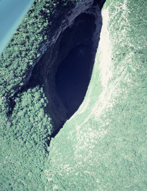 La Caldera, an enormous pit/sink in the Sierra de El Abra of Tamaulipas. Peter Sprouse photo, 1989.