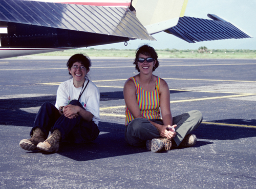 Laura and Bev staying cool on the tarmac in Cd. Victoria, Tamaulipas. Peter Sprouse photo, 1999.